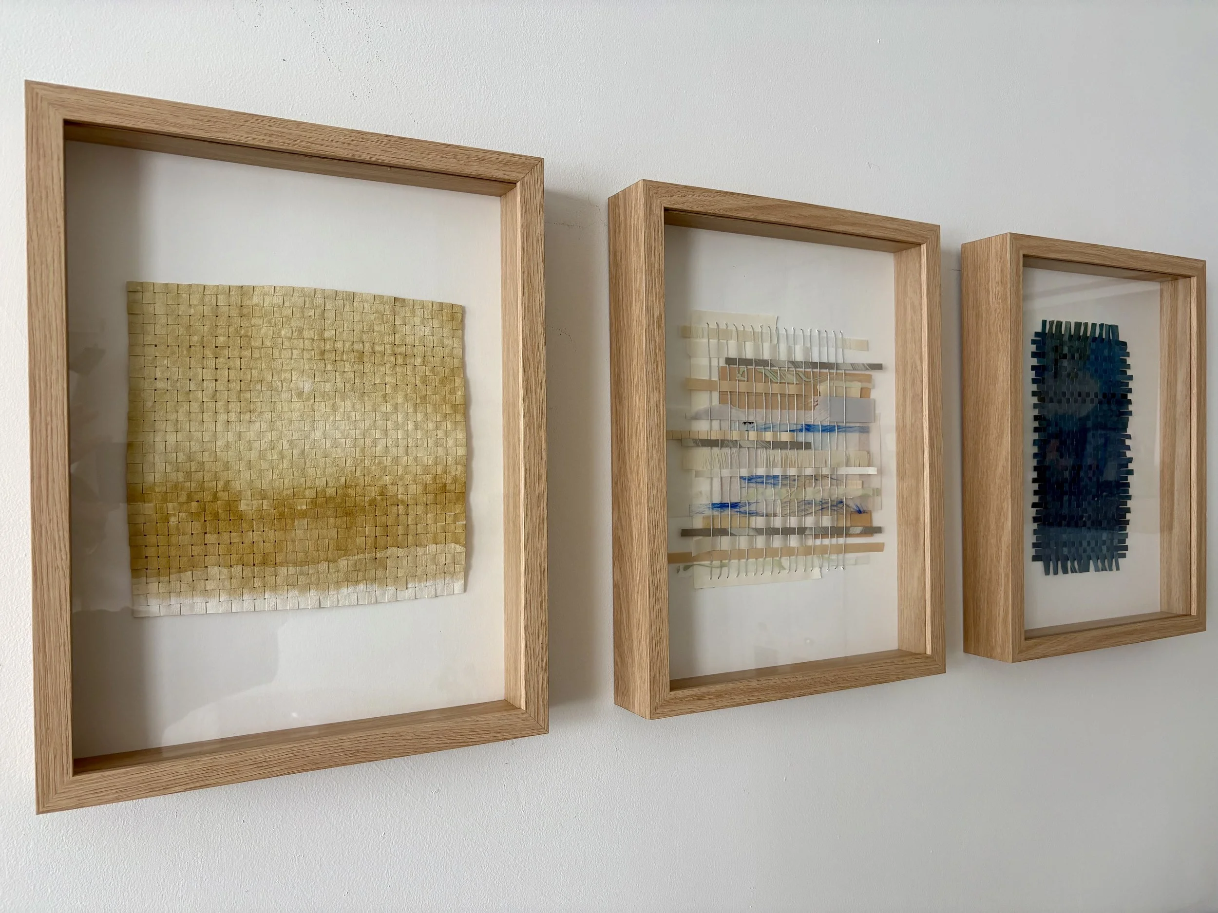 these works are about being in time differently. slow and steady weaving, hours of mixing pigments, steeping dyes and paper. letting the sun make images. homemade colors from the kitchen.